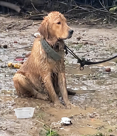 山东德州。一户人家举行婚礼,家养金毛被套在一旁树下泥地上,雨中狗狗满身泥泞狼狈不堪,表情哀怨。拍摄者表示,可能因为当天人很多,主人家怕伤到小孩,就把狗拴到一边了,后来叫它给它吃的都没理。