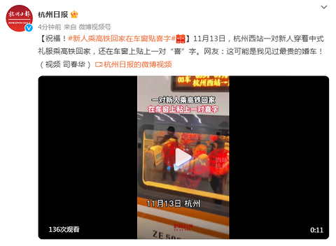 杭州西站一对新人穿着中式礼服乘高铁回家,还在车窗上贴上一对“喜”字。网友:这可能是我见过最贵的婚车! 来源:杭州日报微博