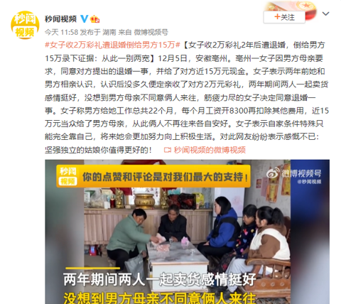 近日在安徽亳州,女子跟男子是两年前相亲认识的,当时认识没多久就订婚了,收了2万块彩礼,这两年期间令人在一起卖货感情很好,可是男方母亲却不同意两人来万,于是女子同意退婚。女子说男子跟他在一起工作了22个月,算上工资扣掉其他的费用,然后给了对方母亲将近15万,从此各自安好。 说实话,想不通男方母亲是怎么想的,如果不同意,当初为什么要定亲呢?如果如女子所说的两人感情很好,那么为什么男子不出来说话呢?男