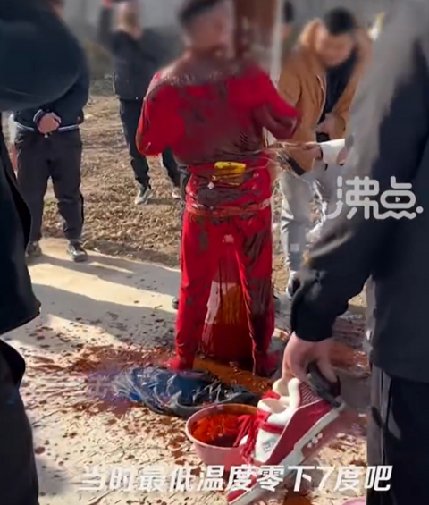 安徽宿州。一新郎身穿红色秋衣秋裤被朋友们用胶带绑在电线杆上,身上被泼满酱油豆瓣酱等混合液体。视频拍摄者称,称当天最低温度零下7度,感觉还是挺冷的,绑了十几分钟,当时觉得不太可能泼