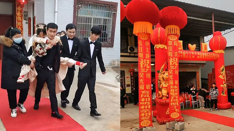 发小结婚互为邻居仅一墙之隔,铺红毯新郎背新娘接亲:婚车都省了