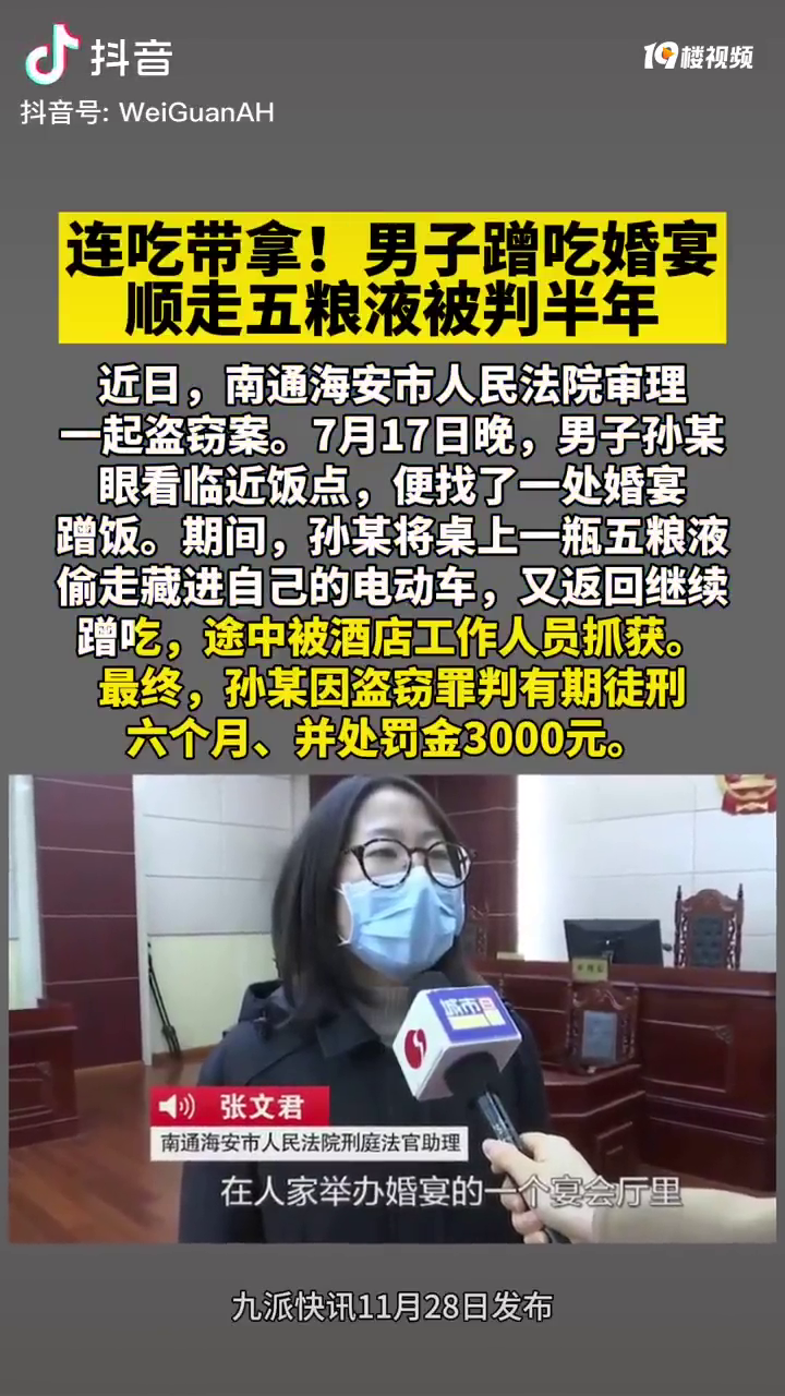 连吃带拿!男子蹭吃婚宴顺走五粮液获刑半年