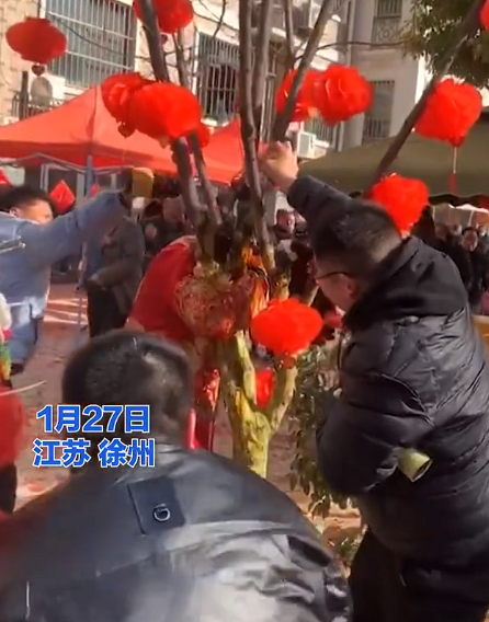 新郎被绑树上倒酱油扔鸡蛋 ,拍摄者:没生气,洗干净又继续出发