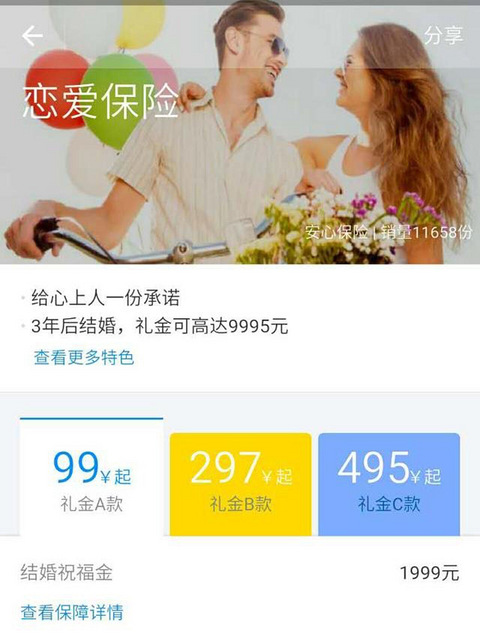 在网上看到的,支付宝居然还有这个服务有点凡尔赛式苦恼了,本来坚定一万元,可是想想人生很难还有机会选择一万支玫瑰了吧。2017年情人节,男盆友购买了支付宝的恋爱保险,我们也很快就要去兑现啦,很多好朋友可能对【恋爱保险】一知半解,我查了资料,尽量给大家唠唠清楚~2015年11月-2019年11月 中国人寿 推出恋爱保险,售价299(学生和军人199),在3年以后10年以内领取结婚证,即可获得1万朵玫瑰