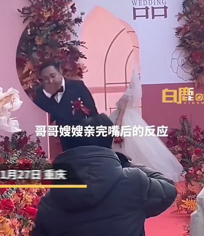重庆。一对新人亲吻后,新郎擦嘴新娘捂嘴逗笑众人。廖女士介绍,视频是在哥哥婚礼上拍到的,当时可能是因为口红粘在新郎的嘴上了,所以新郎在擦。新娘也不是干呕,而是在捂嘴笑。看到这一幕自己都笑疯了