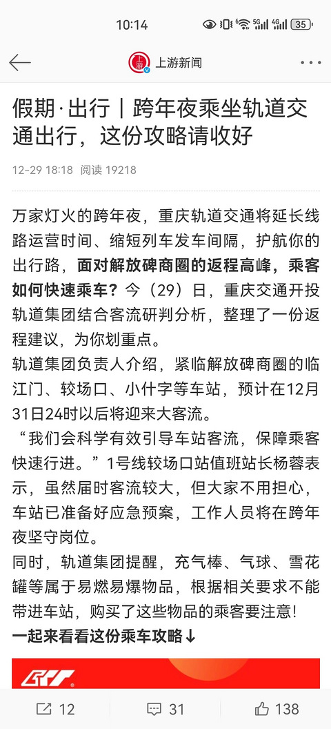 万家灯火的跨年夜,重庆轨道交通将延长线路运营时间、缩短列车发车间隔,护航你的出行路,面对解放碑商圈的返程高峰,乘客如何快速乘车?今(29)日,重庆交通开投轨道集团结合客流研判分析,整理了一份返程建议,为你划重点。原标题 假期·出行|跨年夜乘坐轨道交通出行,这份攻略请收好来源 上游新闻