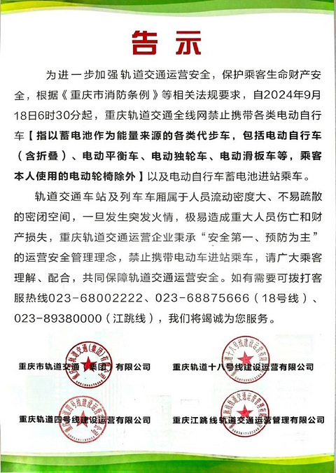 上游新闻从重庆轨道交通获悉,为进一步加强轨道交通运营安全,保护乘客生命财产安全,自2024年9月18日6时30分起,重庆轨道交通全线网禁止携带各类电动自行车以及电动自行车蓄电池进站乘车。