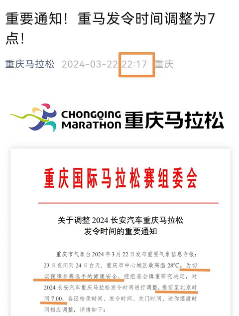3月22日晚,重庆马拉松微信公众号发布推文称3月24日,重马将开跑,重庆市气象台发布气象信息专报,23日夜间到24日白天重庆市中心城区最高温28℃。 此外,4条轨道交通线路运营时间提前。 轨道交通线路重庆交通开投轨道集团消息,为做好“2024重庆国际马拉松”赛事期间轨道交通保障工作,明天(3月24日),轨道交通环线、3号线(不含北延伸段)、6号线、10号线共4条线路运营时间由06:30提前至05: