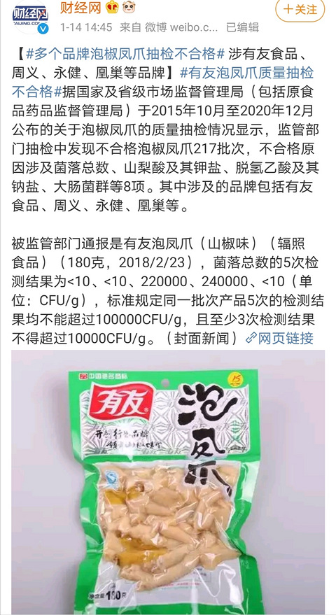 有友等品牌的泡椒凤爪抽检不合格,你最近吃他家凤爪没?
