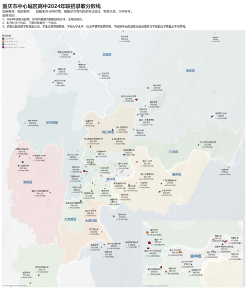 重庆2024年的联招分数线已经出炉,为近9年新低543分。 这几天陆续看到很多机构发布了今年各联招校的录取分数线,估计有不少家长朋友,都不太清楚主城区联招校的位置分布,及各区分别有多少所学校。 这几天根据多方发布的录取分数线(有不一致的取最低值),一张数据地图,供感兴趣的朋友参考。 中考的帷幕已经落下,但青春的梦想才刚刚扬帆。中央公园的每一片绿叶,每一缕阳光,都将见证着这座城市的活力与希望。目前一