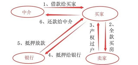 手上暂时没有钱全款买房,让中介借钱给你全款买房,产权交易后把产权抵押给银行,银行再放款给你,再把钱还给中介。 这个流程是二手房交易中常见的问题。卖家不接受买家按揭买房,而买家(也就是你)暂时资金有困难或者不愿意全款买房,为了达到交易的目的,就得找一个第三方的资金来帮助买家暂时垫付购房款,从而达到卖家需要买家全款购房的目的。这种交易流程如下图: 为什么会有这种交易流程呢?这种交易有什么样的风险吗?这