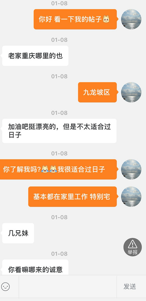 84年底的天蝎座重庆妹儿,未婚,身高163cm,重庆土著,南坪人,独生子女,性格较好,有稳定工作,年收入15W左右, 平时基本两点一线,圈子小,不会打麻将,不打游戏,喜欢旅游,健身,拍照。希望你三观正,彼此真诚相待,有边界感。有稳定职业,户口重庆的,身高170以上,未婚或离异孩子最好跟对方,有一定经济基础,搞到好耍的,就不要来了,时间宝贵,没得时间奉陪。异地ip, 骗子勿扰、海王也不要搭理我、搞投