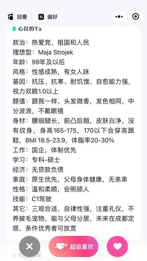 今天开始很认真相亲了,所以每一个聊的都很认真,不管是自己在购物狂认识的还是介绍认识的,3月初见了一个别人介绍的对象,说实话我年纪也到这了,也不怎么看长相了,对方比我大8岁,38岁,身高估计有175左右,收拾得很干净,隐隐约约还看得到胸肌那种,哈哈哈但是长相就很一般了,就是那种大叔的长相,一看就是经历过啥的。 据朋友介绍给我说的,他离过一次婚,没有小孩,早些年我还比较介意这个事,不过现在看开了,觉得