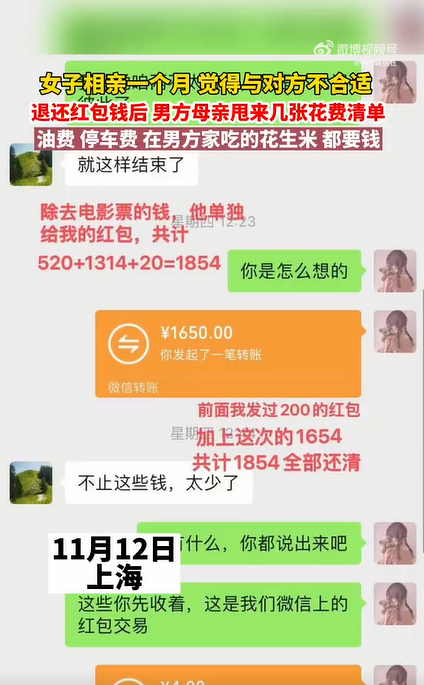 女子与男子相亲一个月后,觉得不太合适,提出分手,当天就退还了男方转账的钱。结果男方母亲甩来几张清单,大到电影票,小到油费、停车费。连邀请去男方家中吃饭都要算钱。