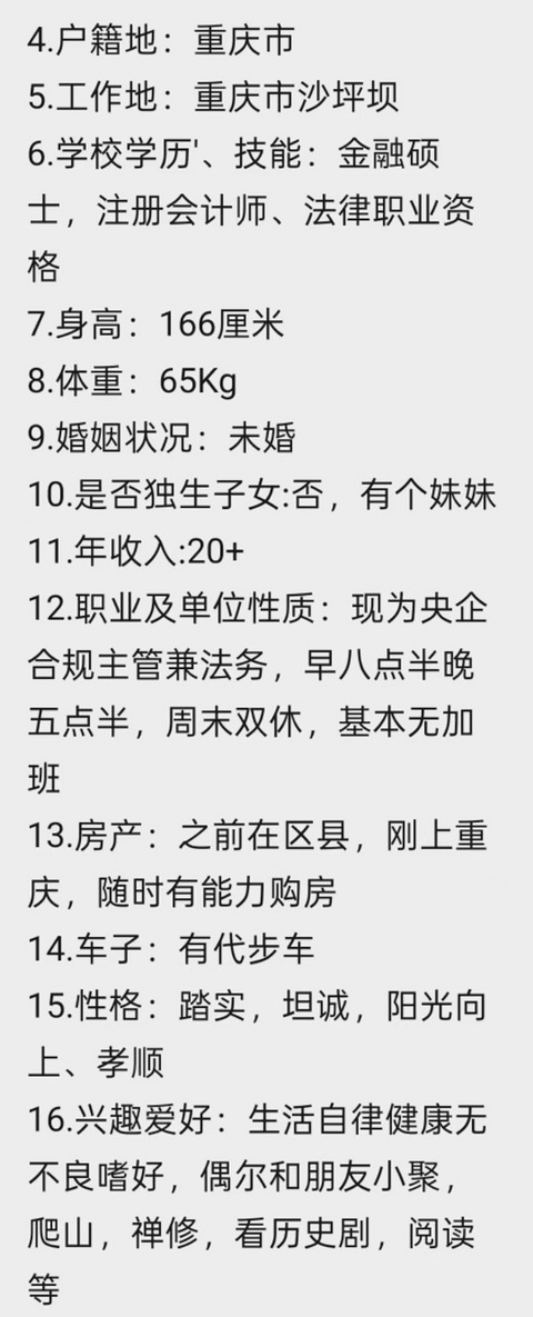 重庆城里人|87年|净身高162cm | 大专学历 | 未婚未育个人自媒体(全网100W+粉丝)性格优点:开朗乐观,阳光治愈,耐心安静,外冷内热,努力上进心,孝顺父母,藏着一颗善良真诚、细腻温暖的心有原则和底线生活爱好:做饭/运动/画画/养猫狗/服装设计/拍摄/电影/看书/探店美食/旅行探索经济状况:年收入较高,工作稳定,有存款,有房没车(为了长远考虑,和未来爱人共同买房。我是宅女在家做自媒体暂时