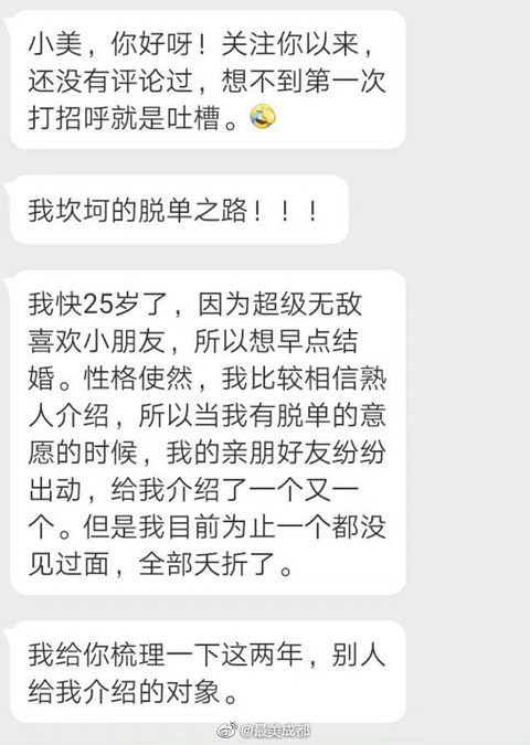 小美,我25岁女生的坎坷脱单之路!我很喜欢小朋友,也想早点结婚。亲戚给介绍的男生,在新J工作,每年回来一次,要我等他8年!不肯加微信,不肯打电话,只让他妈妈来我家里看我一眼,说他妈觉得行就行… 你最近有相亲奔现吗? 网上看到的,心疼妹子一秒