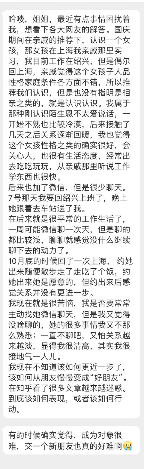 “对相亲的女孩有好感。我现在就是苦恼我是否要常常主动找她聊天?但是我又觉得没啥聊的,她的很多事情我又不那么熟悉;一直不聊吧,又怕关系越来越淡,显得我很清高。有时候觉得找对象很难,交个新朋友也很难”