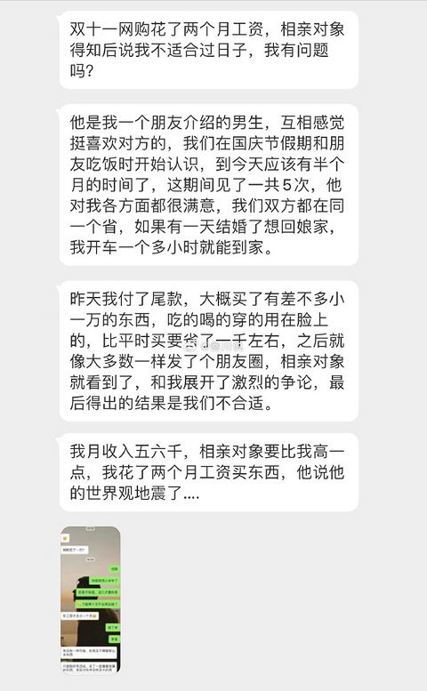 双十一网购花了两个月工资,相亲对象得知后说不适合过日子,你们觉得这有问题吗? ?