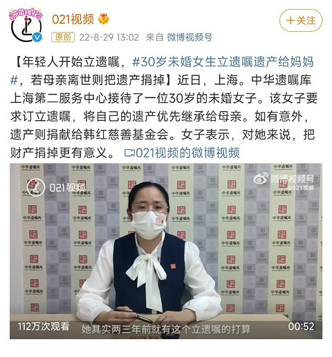30岁的女生,没有结婚,就立遗嘱把所有财产留给妈妈。你怎么看?会不会有很多女生效仿呀? ? ?年轻人开始立遗嘱,30岁未婚女生立遗嘱遗产给妈妈,若母亲离世则把遗产捐掉 近日,上海。中华遗嘱库上海第二服务中心接待了一位30岁的未婚女子。该女子要求订立遗嘱,将自己的遗产优先继承给母亲。如有意外,遗产则捐献给韩红慈善基金会。女子表示,对她来说,把财产捐掉更有意义。