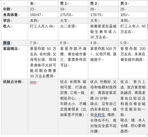 下面有这个情况,佩服这个妹子还做了表男1现在是一年多的男友,但是他不稳定因素太多了,没告诉家里我恋爱了。另外两位是相亲对象,现在妈妈生病了,希望我快点结婚。 ?