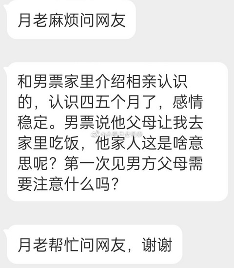 和男票家里介绍相亲认识的,认识四五个月了,感情稳定。男票说他父母让我去家里吃饭,他家人这是啥意思呢?第一次见男方父母需要注意什么吗? ?