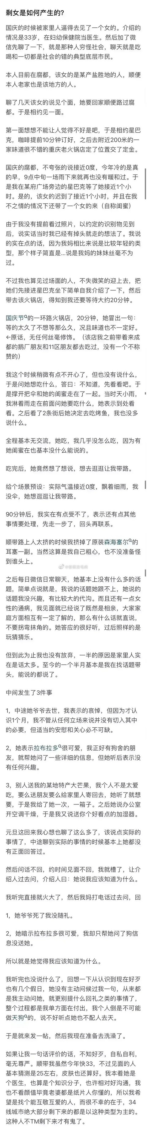 这事儿你们怎么看? 原帖如下国庆去相亲了,女方33岁,在妇幼保健院当医生。约好在星巴克见面,当时我等了她接近1个小时。是的,她不光迟到了接近1个小时,并且在我不知情的情况下还带了一个女的来。见了第一面,我就有想走的想法了。说实话,说她是我妈的妹妹丝毫不为过......