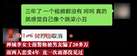 近日,广东佛山,禅城李女士经同学刘某介绍与男友相识,两人相谈甚欢,让她对这段感情深信不疑。男生恋爱4年间不露面骗女生20万,然而确认恋爱关系4年,男友从未露面,只在急需用钱时编造各种借口要钱。直至再也无法联系时,李女士才察觉被骗。民警调查发现,刘某一人分饰了李女士的同学、男友和男友父亲3个角色,先后诈骗李女士20余万。目前,刘某已被依法刑拘,案件正在侦办中。