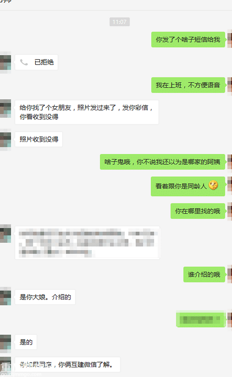 大清早的,老爹忽然发个带照片的彩信给我,然后我才知道,原来是亲戚给我介绍的媳妇~~~ 亲戚介绍的对象~搞不好还要得罪人 晚上下班回来,老爸打电话给我问怎么回绝,怕得罪亲戚,扯了半天,我终于想了个理由,就说我只有1米55,看对方妹子介不介意~~~
