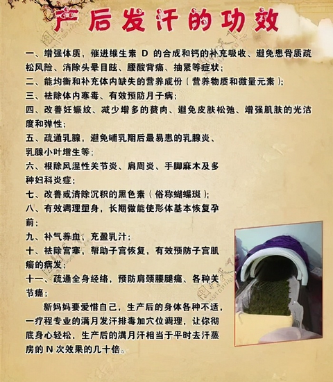 有几个朋友生了宝宝之后都去产康中心做了产后发汗,回来反馈说觉得挺好的,说发汗后整个人人生气爽的,我也被说得心动了,想去做一个。但是看到这篇帖子,我有点搞不清楚状况了。产后发汗到底是好还是不好? 这是网上看到的一篇说产后发汗的好处的,商家打的广告,看着好处还挺多的。