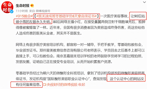 在刚刚过去的315晚会上 ,曝光了不少「黑心」商家,尤其以那些没有医疗资质的美容中心最让人气愤,真的是害惨了消费者。 90后姑娘小雪在一次医美事故中,永远地失去了一只眼睛,而给她做美容的“师傅”,根本没有执医资格。 转自育学园
