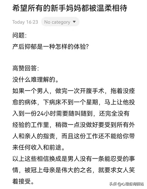 如果一个男人,做完一次开腹手术,拖着没痊愈的病体,下病床不到一个星期,马上让他投入到一份24小时需要随叫随到,还完全没有经验的工作里,稍微一点没做好要受到所有外人和亲人的指责,而且这份工作还不能给你带来任何收入和前途。以上这些相信换成是男人没有一条能忍受的事情,被冠上母亲是伟大的之名,就要求女人笑着接受。