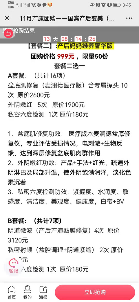 最近管管发的产康团购开始了,进群看了一圈,发现这个私密的套餐我真的看不懂?价格看起还是多优惠的,111就可以体验3次,999就可以做一个疗程 有没有做过的妈妈来说说呀,私密到底做些啥?