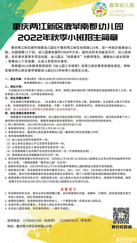 两江新区鹿苹南郡幼儿园2022年秋季小班招生100人