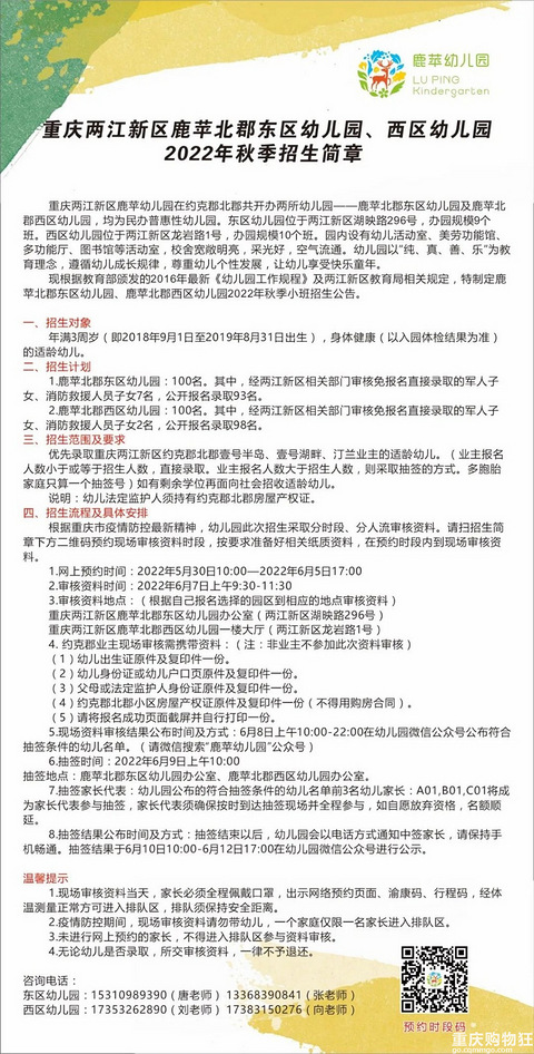 两江新区鹿苹北郡东区、西区幼儿园2022年各招生100人