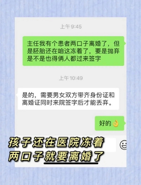 小红薯上看到的。在生殖中心看见过很多因为要孩子两口子离婚的,大部分都是要不上。有的是女方觉得对不起男方,有的是男方觉得不生孩子人生不完整,有的是父母在中间闹,有的是觉得对不起媳妇儿觉得给不了她最好的。种种种种吧,真的应了那句话。幸福家庭一样幸福,不幸的家庭各有各的不幸。 今天这个姐姐36 岁,和老公结婚一直要不上孩子,做过手术,现在来做试管。试管的治疗费是娘家给掏的,特别意外的她卵巢功能非常不错,
