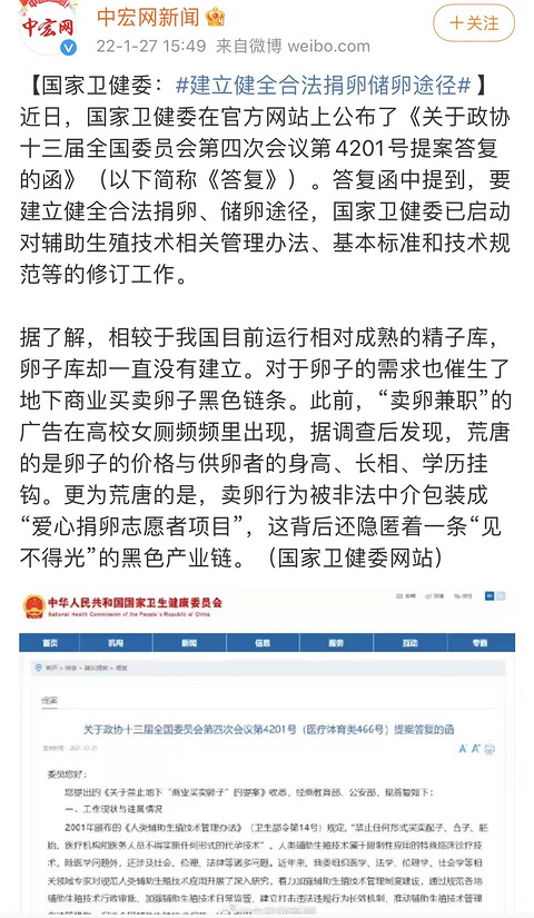 【国家卫健委答复委员提案:#建立健全合法捐卵储卵途径#】受益于人类辅助生殖技术发展,许多不孕不育夫妇得以实现当父母的愿望,相较于我国目前运行相对成熟的精子库,卵子库却一直没有建立。澎湃新闻此前报道了高校女厕里的“卖卵兼职”广告,调查发现卖卵的价格与供卵者的身高、长相、学历等挂钩,卖卵行为成了中介口中的“爱心捐卵志愿者项目”,这背后还隐匿着一条“见不得光”的黑色产业链。 2003年颁布的《卫生部关于