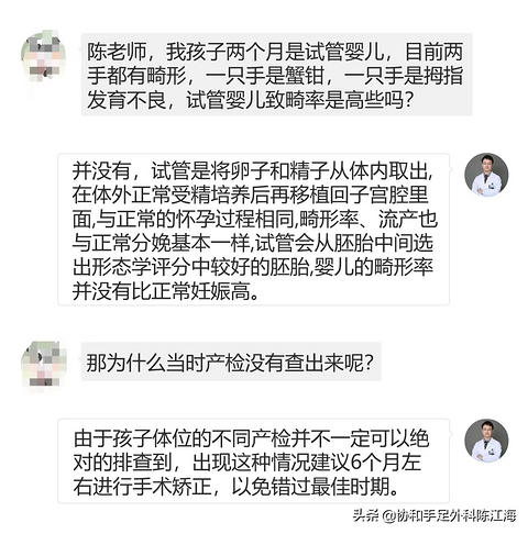 转自协和手足外科陈江海 宝宝是试管婴儿,现在双手畸形,难道是试管的错? 试管是将卵子和精子从体内取出,在体外正常受精培养后再移植回子宫腔里面,与正常的怀孕过程相同,出现手足畸形的情况建议选择在6个月左右进行手术矫正,以免错过最佳时期。