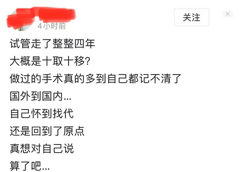 做试管整整四年,经历了十取十移,太佩服她的执着了。如果是我的话,估计在第二次第三次的时候可能就已经放弃了。