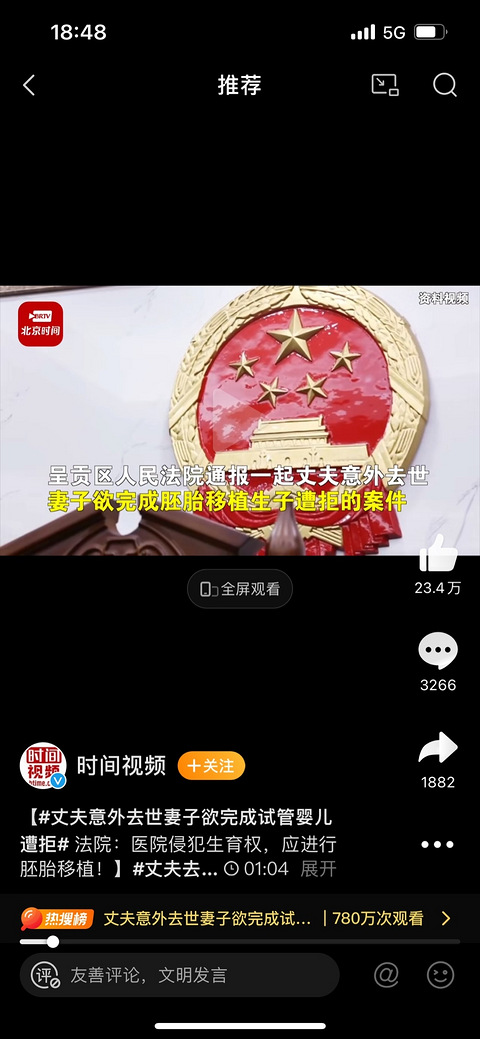 【#丈夫意外去世妻子欲完成试管婴儿遭拒# 法院:医院侵犯生育权,应进行胚胎移植!】#丈夫去世妻子想完成试管婴儿遭拒#近日,云南昆明呈贡区人民法院通报一起丈夫意外去世,妻子欲完成胚胎移植生子遭拒的案件。一对夫妻2014年结婚后长期未生育,2020年到昆明某医院接受人类辅助生殖治疗。2021年8月,就在两口子准备进行冻胚移植手术期间,丈夫因车祸意外去世。同年9月,妻子到医院拟进行冻胚移植,却被医院告知