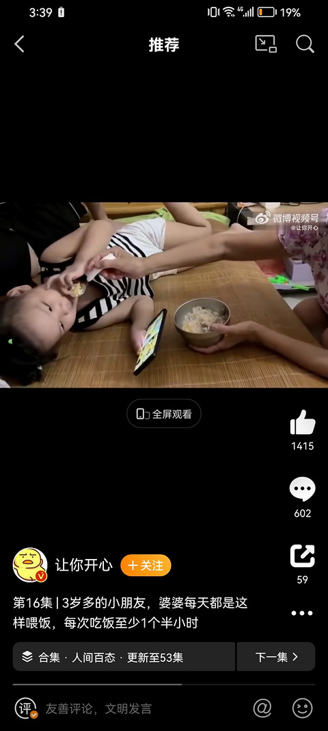 在网上看到的视频这个三岁小朋友躺在床上,玩着手机婆婆给他喂饭,一个半小时! 我的天啦,这是怎么忍下去了!联想到我家的娃 两岁不好好吃饭 想要玩具我就控制不住自己的暴脾气 想揍人了!