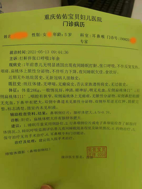我们是在上幼儿园小班的时候出现腺样体肥大的症状的,睡觉打鼾,去年疫情恼火就没去医院,今年5月份,可能是换季,经常的流鼻涕,鼻塞,刚开始都以为是感冒但是就是一直好不彻底,我还以为是遗传了我的鼻炎。 然后有次周末我就带他去了佑佑宝贝的耳鼻喉科检查,找的汪洋主任,当时汪主任了解一下病情,看了看鼻子、喉咙,就考虑蔻蔻是不是有腺样体肥大的问题,让我们拍了个鼻咽片,结果真的是腺样体肥大0.76,而且扁桃体也