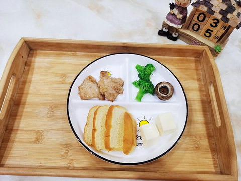 哥今日早餐?主食:小面包?蛋白:自制鸡排?煎蘑菇,西兰花,奶酪块,配方奶200ml