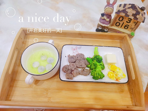 主食:芝麻汤圆蛋白:牛排西兰花,煎鹌鹑蛋,奶酪块,配方奶200ml