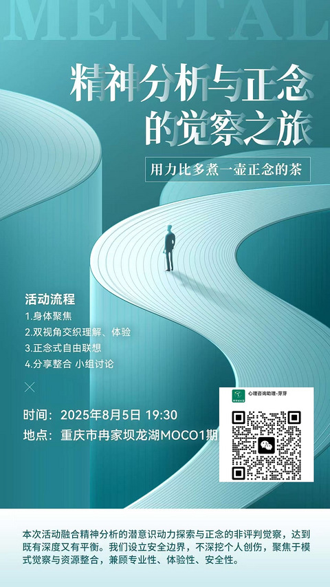 欢迎踏上这场独特的觉察之旅!我们将融合精神分析(探索潜意识动力)与正念(非评判性觉察)的双重视角,安全地探索内在行为、情绪与思维模式,唤醒当下的觉知。