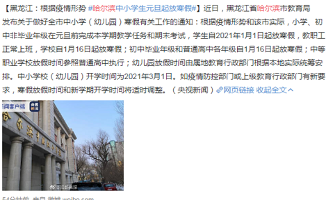 黑龙江省哈尔滨市教育局发布关于做好全市中小学(幼儿园)寒假有关工作的通知:根据疫情形势和该市实际,小学、初中非毕业年级在元旦前完成本学期教学任务和期末考试,学生自2021年1月1日起放寒假,教职工正常上班,学校自1月16日起放寒假;初中毕业年级和普通高中各年级自1月16日起放寒假;中等职业学校放假时间参照普通高中执行;幼儿园放假时间由属地教育行政部门根据本地实际统筹安排。中小学校(幼儿园)开学时