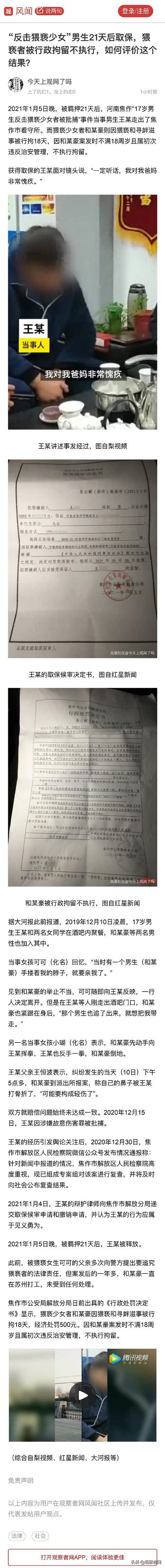 2021年1月5日晚,被羁押21天后,河南焦作17岁男生反击猥亵少女者被批捕事件当事男生王某走出了焦作市看守所。而猥亵少女者和某豪则因猥亵和寻衅滋事被行拘18天,因和某豪案发时不满18周岁且属初次违反治安管理,不执行拘留。 获得取保的王某面对镜头说,一定听话,我对我爸妈非常愧疚。 现在做好事代价太大了,帮助被猥亵女生还要被拘留,以后谁还敢见义勇为?小朋友很优秀,希望不要对社会失望
