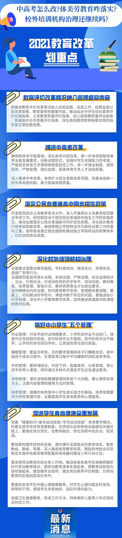 看图,官方发布的教育改革重点教育评价改革中高考改革招生政策校外培训机构治理中小学生作业、睡眠、手机、读物、体质都要纳入管理