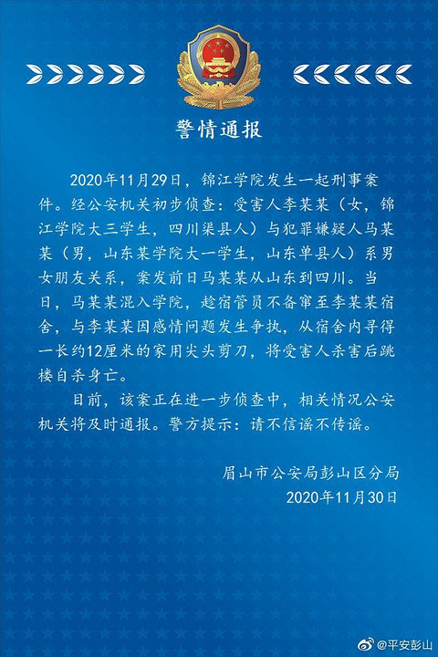 警方通报四川高校2死命案:男方混入宿舍杀害女友后跳楼