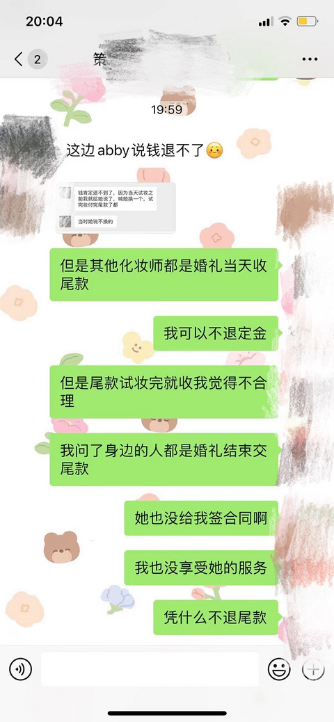 【更新】补充证据 【更新】补了图,刚发现化妆师把我拉黑删除了懒得注册号,借的朋友的。太长不看版:重庆知名化妆师妆造差、态度雕、无契约精神,道德绑架,拒绝退尾款详细过程还有半个月就要结婚了,和之前预约好的化妆师准备9.25见面试妆。结果21号化妆师给我说,想去接个活动,让我推迟试妆。。。。。你说让我说什么好呢?我8月提前约的9.25,现在来说要接活动。中秋后就是工作日,然后还要国庆调休补班,只有25