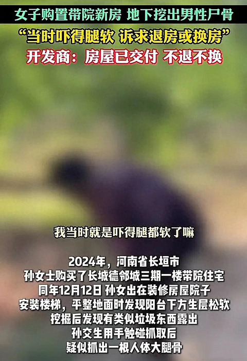 女子购置带院新房,地下挖出男性尸骨。开发商:已交付,不退不换